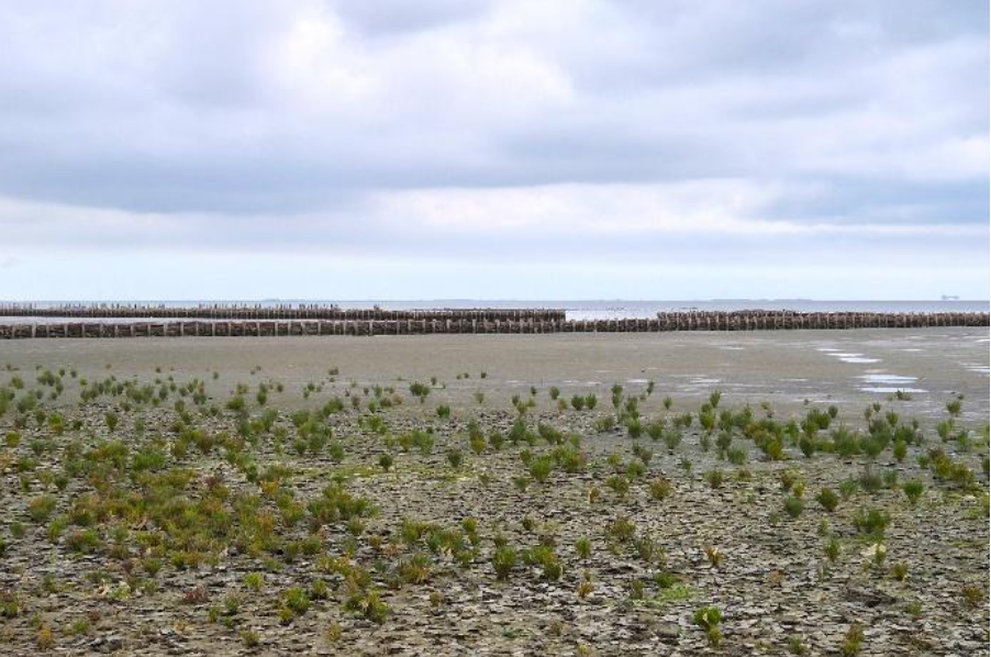De kwelderrand (zeereep) een jaar na aanleg van de rijsdammen met aan de westzijde welig tierend zeekraal!